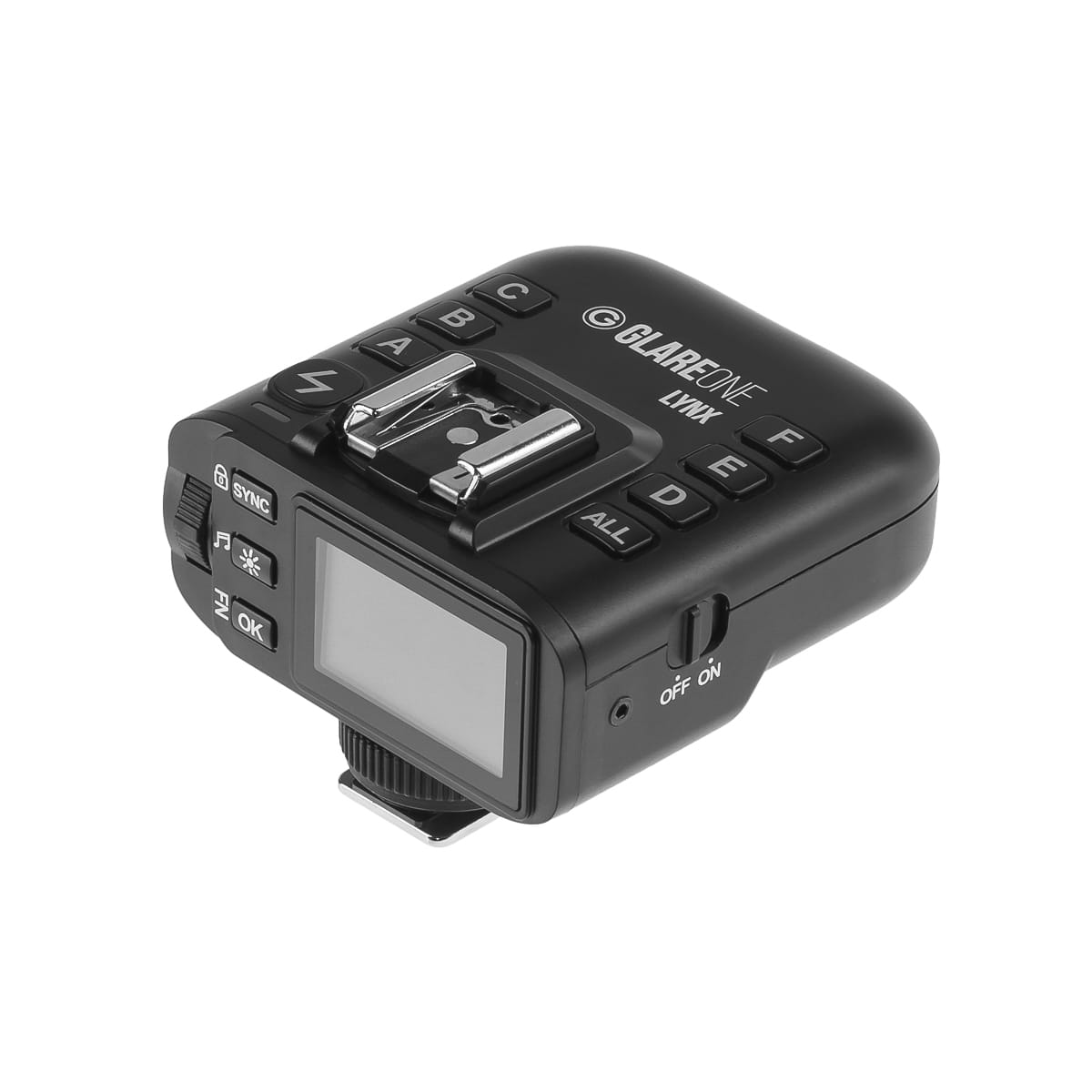 GlareOne Lynx to zaawansowane urządzenie, które może działać zarówno jako nadajnik (domyślnie), jak i odbiornik, oferując wszechstronność w zarządzaniu systemem oświetlenia fotograficznego. Na górnej części urządzenia umieszczone są sanki, w które możemy wsunąć lampę nieposiadającą sterowania radiowego i wyzwalać ją zdalnie z innego urządzenia GlareOne w trybie MASTER.